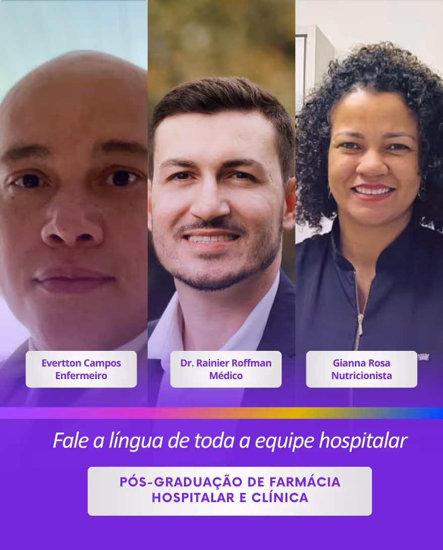 Acreditamos que para ser um farmacêutico de destaque, você precisa falar a língua do hospital. Por isso, você terá aulas com médicos, enfermeiros, fonoaudiólogos, nutricionistas e biomédicos para entender as dores, os processos e as necessidades de cada setor.